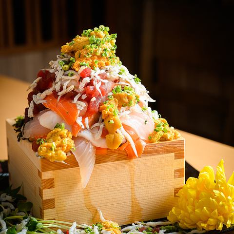 マグロ、サーモン、蛸、鯛、帆立、いくら、ズワイを升に酢飯をいれ海鮮を席で豪快におかけします。札幌店の限定メニューとなります。※食材在庫の都合上、予約限定となりますのでぜひお早めにご予約をお待ちしております。